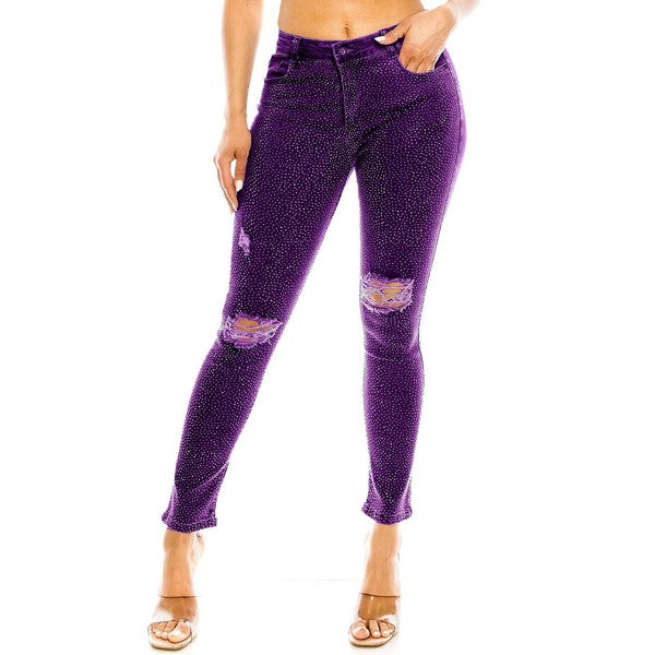 - These Purple Denim Pants are embellished with a bling chip rhinestone for added flair.