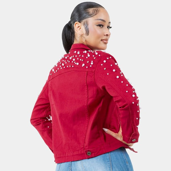 - Stay fabulous in this eye-catching jean jacket adorned with radiant pearls and rhinestone decorations in a bold red color.